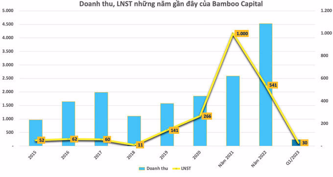 Năm 2022 doanh thu Bamboo Capital đạt 4.531 tỷ đồng, tăng 75% so với năm 2021. Tuy vậy chi phí vốn và chi phí tài chính tăng mạnh nên lợi nhuận sau thuế còn 541 tỷ đồng.