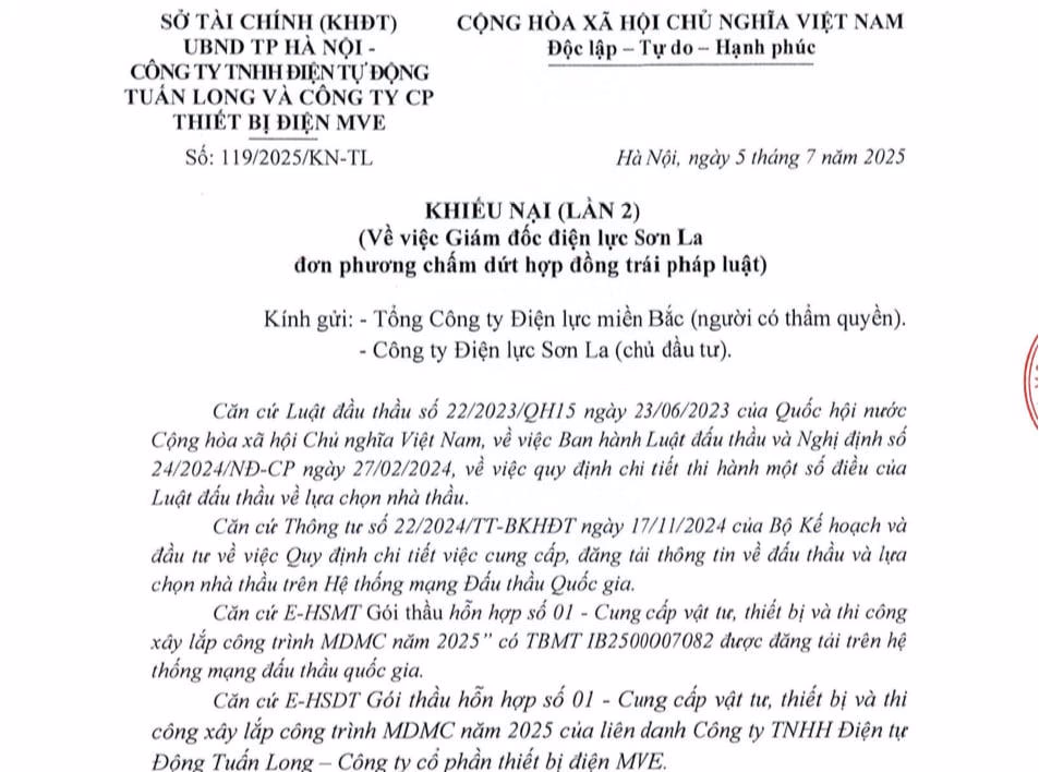 Ở một diễn biến khác có liên quan, ngày 5/7, nhà thầu Liên danh Tuấn Long – MVE tiếp tục có văn bản khiếu nại (lần 2) gửi tới Tổng công ty Điện lực miền Bắc và Công ty Điện lực Sơn La, đề nghị giải đáp nhiều vướng mắc cần được làm rõ.
