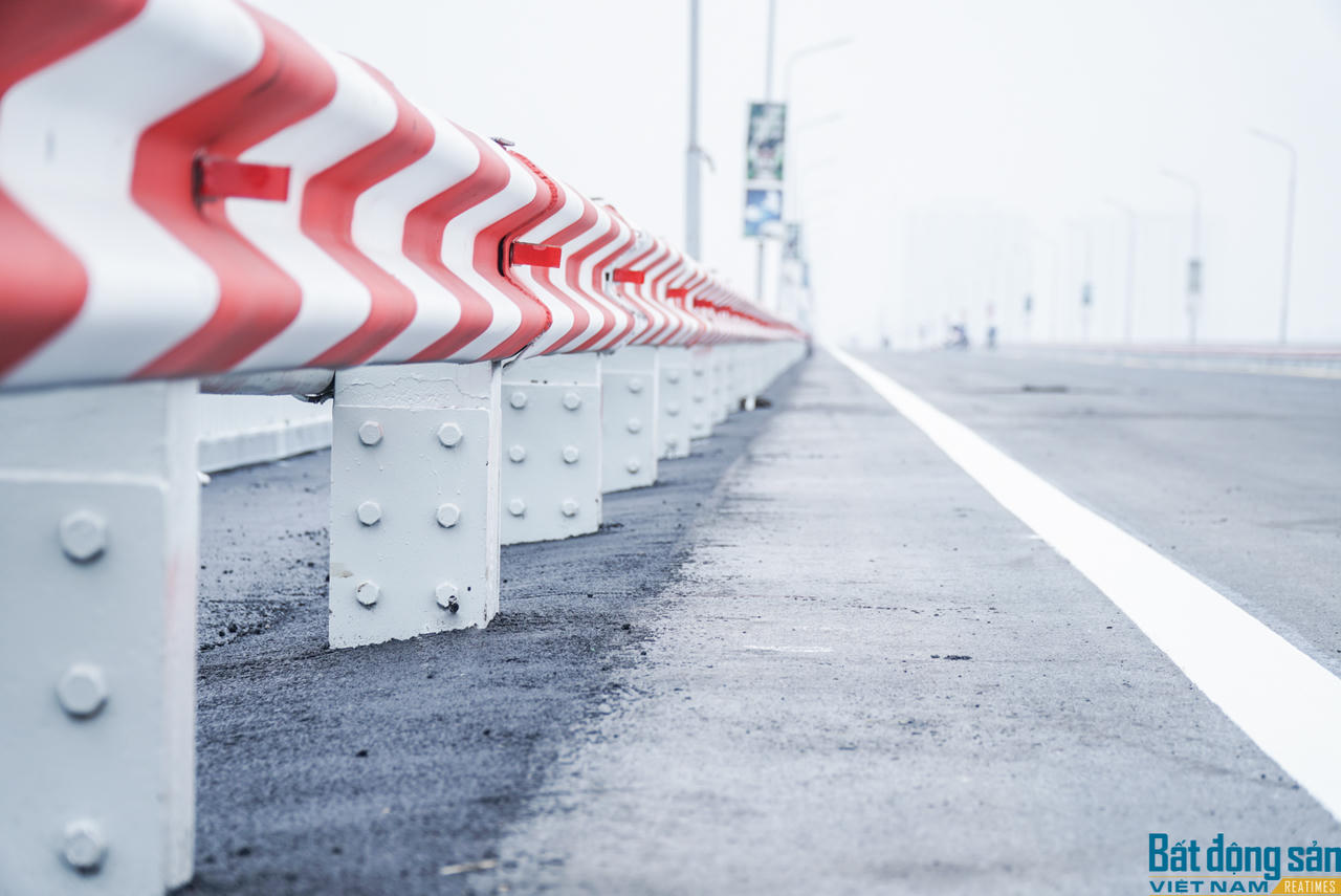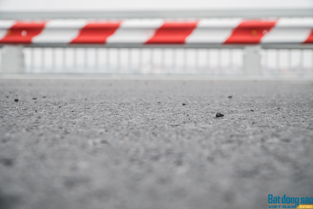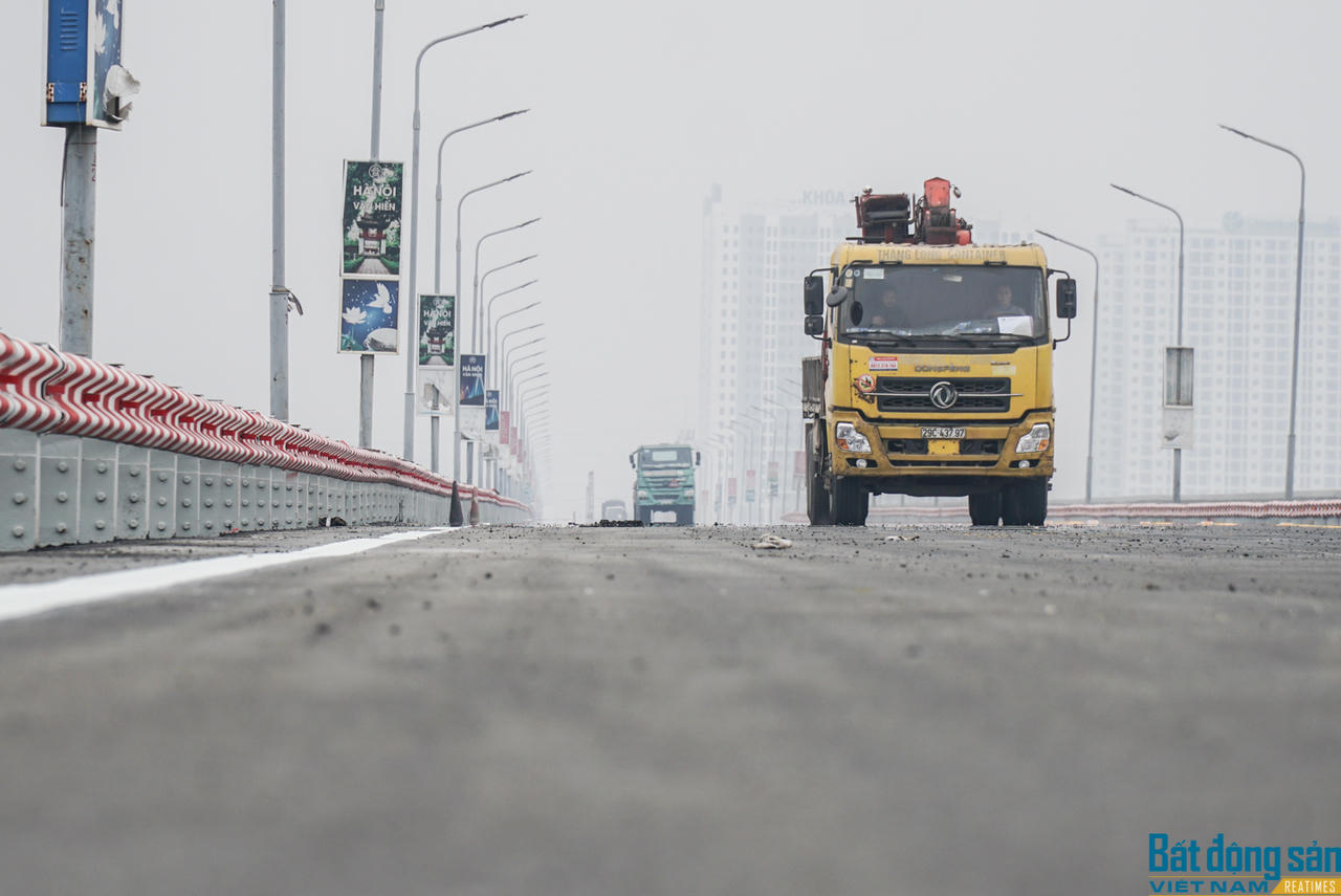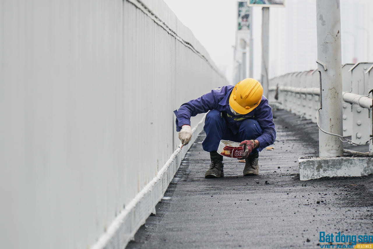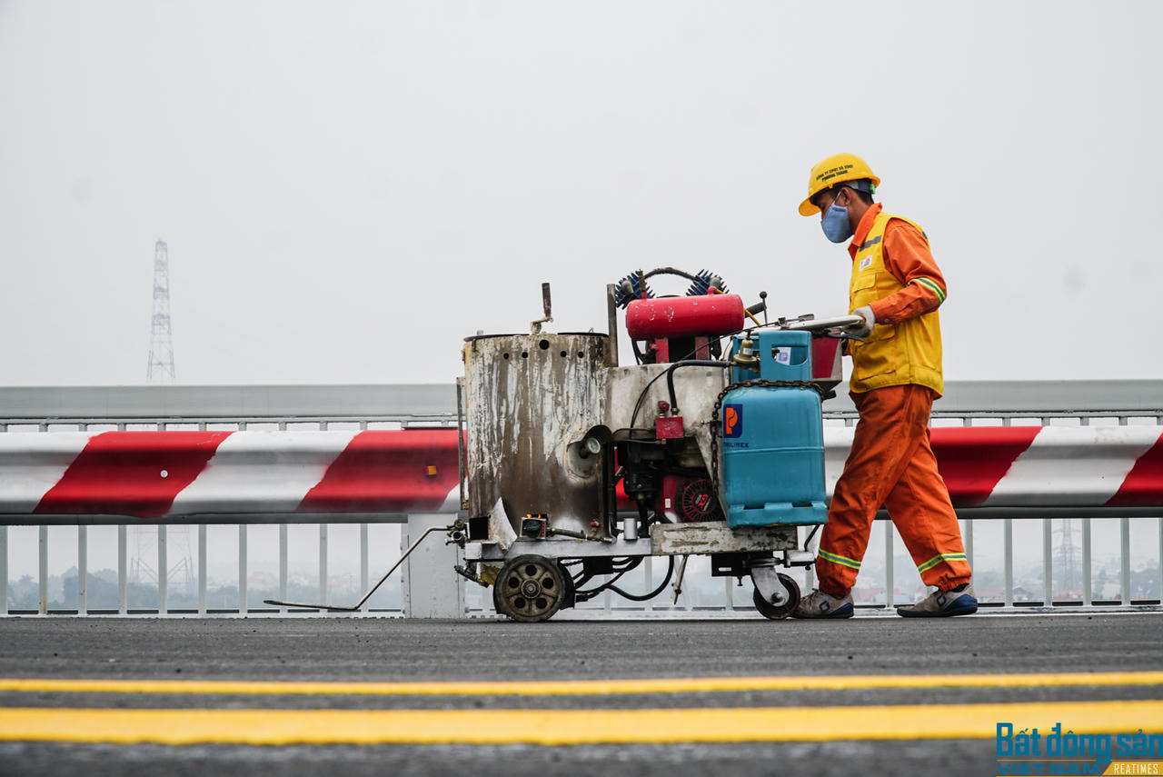 Trước đó, đến ngày 29/12, hạng mục cuối cùng là thảm bê tông nhựa mặt cầu đã hoàn thành. Công nhân đang quét dọn sạch sẽ mặt cầu chuẩn bị cho thông xe.