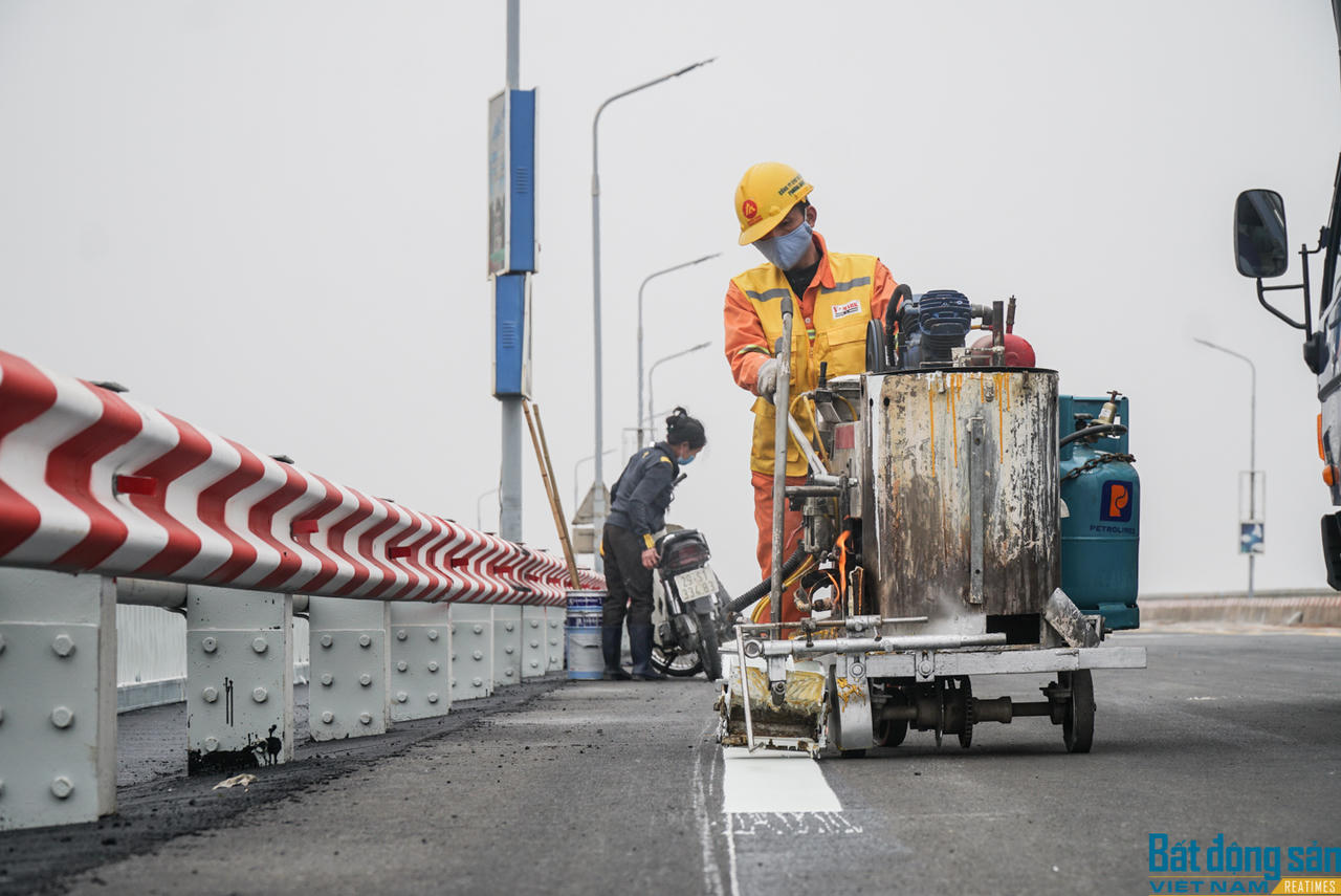 Công nhân đang gấp rút tiến hành sơn vạch kẻ đường cho mặt cầu. Chiều 6/1, hạng mục sơn vạch, kẻ đường đã được hoàn tất.