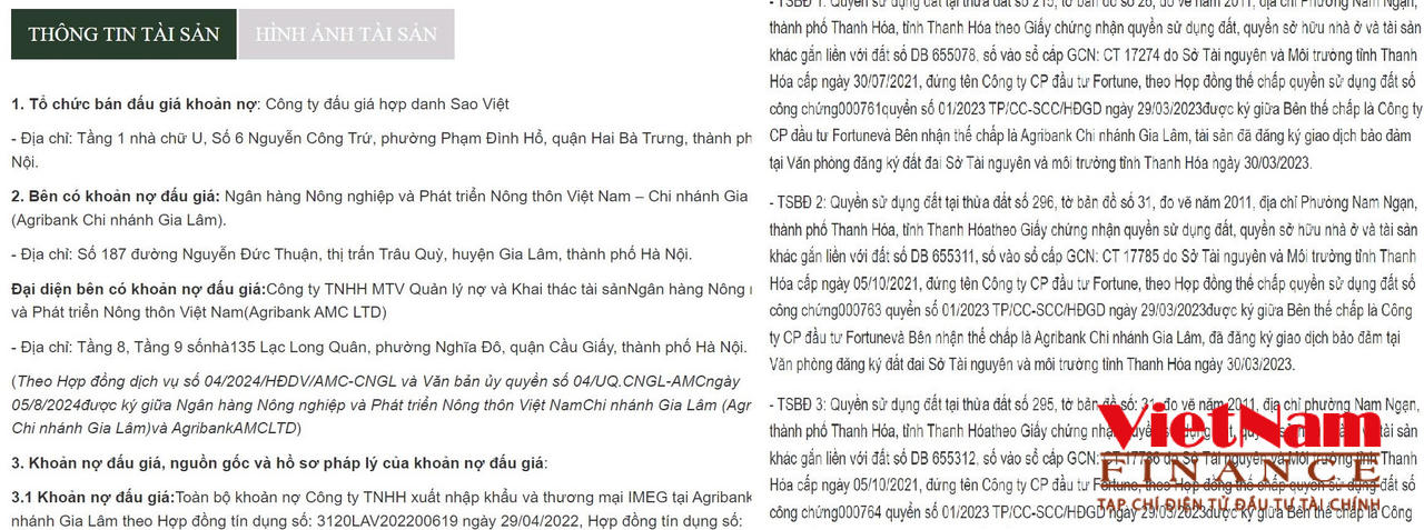 Tài sản bảo đảm của khoản nợ gồm 09 quyền sử dụng đất tại phường Nam Ngạn, TP. Thanh Hoá do Công ty CP đầu tư Fortune đứng tên. Giá khởi điểm đấu giá khoản nợ 119,3 tỷ đồng.