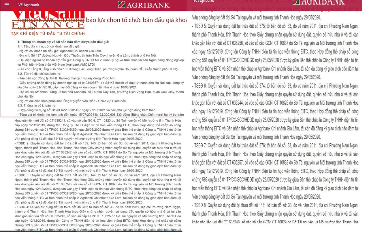 Mới đây, Ngân hàng Nông nghiệp và Phát triển nông thôn Việt Nam (Agribank) - Chi nhánh Gia Lâm uỷ quyền cho Công ty Đấu giá hợp danh Sao Việt thông báo bán đấu giá các lô đất (tài sản bảo đảm) tại Thanh Hoá do Công ty TNHH Điện tử Tin học Viễn thông EITC và Công ty CP đầu tư Fortune đứng tên.