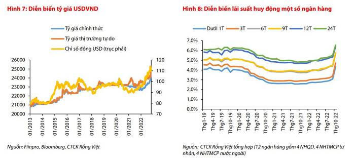 Theo VDSC, hiện tại, lãi suất điều hành đã trở lại mức trước đại dịch vào cuối năm 2019, dư địa tăng tiếp lãi suất điều hành sẽ tùy thuộc vào diễn biến áp lực các yếu tố bên ngoài (Fed, diễn biến chỉ số DXY, đồng NDT), lạm phát trong nước và áp lực mất giá của tiền đồng (cung-cầu ngoại tệ, triển vọng cán cân thanh toán, dự trữ ngoại hối, thanh khoản tiền đồng).