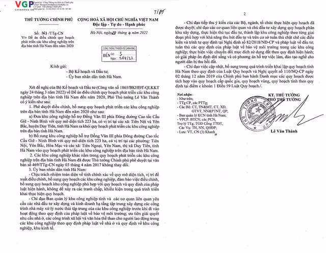 Theo Cổng thông tin điện tử Chính phủ, Phó Thủ tướng Lê Văn Thành đã phê duyệt điều chỉnh, bổ sung quy hoạch phát triển các khu công nghiệp trên địa bàn tỉnh Hà Nam đến năm 2020.