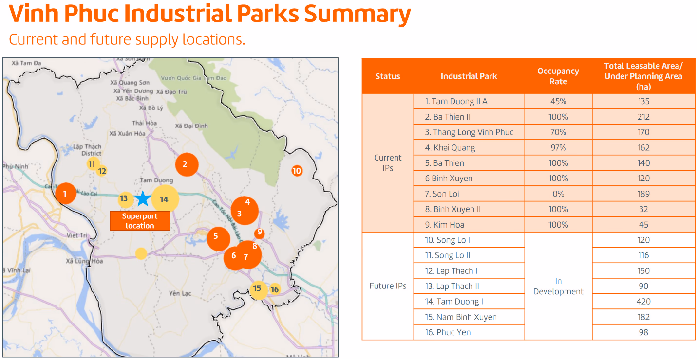 Trên địa bàn tỉnh Vĩnh Phúc hiện nay có 9 khu công nghiệp với tổng diện tích cho thuê hơn 1.200 ha. Riêng huyện Bình Xuyên đã tập trung 6 khu công nghiệp bao gồm Bá Thiện 1, Bá Thiện 2, Thăng Long Vĩnh Phúc, KCN Bình Xuyên, Bình Xuyên 2, Sơn Lôi. Theo kế hoạch, tỉnh Vĩnh Phúc sẽ phát triển thêm 7 Khu công nghiệp với tổng diện tích cho thuê 1.176 ha.