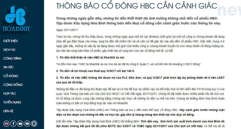 Trước đó, trong thông báo báo chí của Chủ tịch HĐQT HBC Lê Viết Hải ngày 02/11/2017, ông Lê Viết Hải cũng khẳng định các tin đồn về Hòa Bình là hoàn toàn sai sự thật. Theo ông Hải, tin đồn trên mạng xã hội về tình hình kết quả kinh doanh quý 3 và sắp tới của Tập đoàn rất xấu là hoàn toàn sai sự.