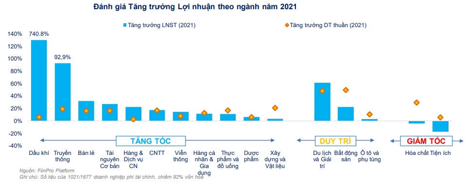 Lợi nhuận sau thuế khối doanh nghiệp được dự báo sẽ tăng tốc trong năm 2022 (tăng 33,1%) trên nền so sánh nhiều ngành ở mức cao. Đáng lưu ý, giới phân tích kỳ vọng tăng trưởng năm 2022 tiếp tục đến từ các doanh nghiệp đầu ngành như: Bất động sản với mức tăng 19,2%; Tài nguyên Cơ bản tăng 22,1%; Công nghệ Thông tin tăng 31,4%.