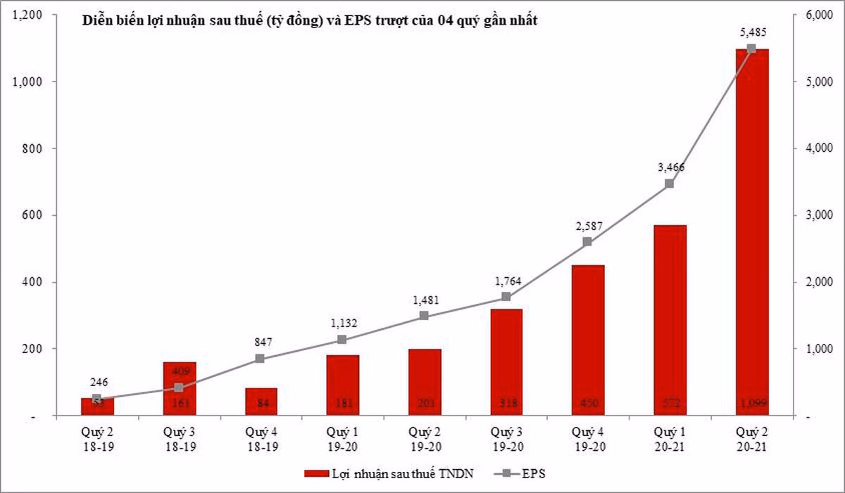 Trong giai đoan vừa qua, giá cổ phiếu HSG của Tập đoàn Hoa Sen đã có diễn biến tích cực. Nguyên nhân chính của việc này là HSG đã có một thành tích đáng nể khi ghi nhận lợi nhuận sau thuế tăng liên tục trong 6 quý liên tiếp, từ 1/10/2019 đến 31/3/2021. Nhờ đó, hệ số EPS trượt của 4 quý gần nhất cũng liên tục gia tăng, và đạt mức 5.485 đồng/cổ phiếu vào cuối quý 2 NĐTC 2020-2021 (từ 1/1/2021 đến 31/3/2021) và hệ số ROE trượt 4 quý gần nhất đạt mức 35%.