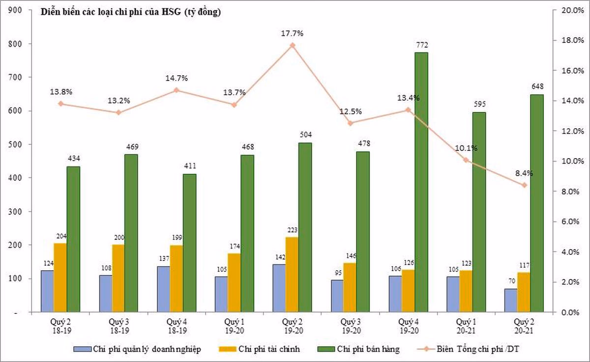 Như vậy, có thể khẳng định, công tác quản lý chi phí của HSG hết sức hiệu quả khi tỷ lệ tổng chi phí hoạt động/doanh thu đã được liên tục kéo giảm từ 13,8% về 8,4% vào cuối quý 2 niên độ tài chính 2020-2021 (từ 1/1/2021 đến 31/3/2021).