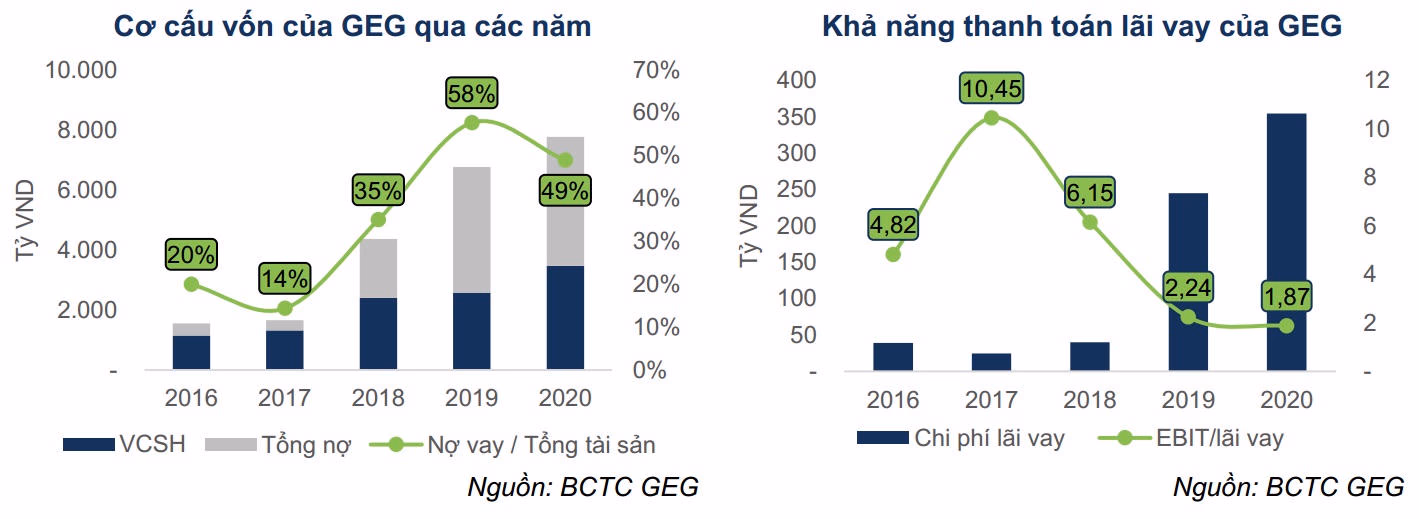 GEG đã trải qua một giai đoạn tăng trưởng vốn rất mạnh để có đủ nguồn vốn đáp ứng cho việc liên tục đầu tư xây dựng nhà máy mới, trong đó bao gồm cả nguồn vốn vay ngân hàng cũng như nguồn vốn từ việc phát hành thêm cổ phiếu và trái phiếu. Hầu hết các dự án điện mặt trời hay điện gió đều có tỷ trọng nợ vay khoảng 70-80%, khiến cho tỷ lệ đòn bẩy của GEG tăng lên khá nhanh.