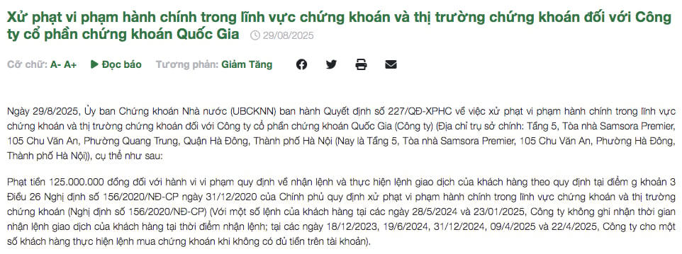 Theo quyết định xử phạt, Công ty cổ phần Chứng khoán Quốc Gia bị phạt tiền 125 triệu đồng đối với hành vi vi phạm quy định về nhận lệnh và thực hiện lệnh giao dịch của khách hàng theo quy định của Nghị định số 156 ngày 31/12/2020 của Chính phủ.