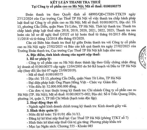 Với những vi phạm trên, Cục Thuế Hà Nội quyết định xử phạt Công ty cổ phần cao su Hà Nội với tổng số tiền thu hồi tiền hoàn thuế GTGT, tiền thiếu thuế TNDN qua thanh tra, tiền phạt, tiền chậm nộp là 6,744 tỷ đồng.