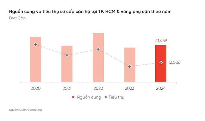 Sức cầu chung của thị trường vẫn duy trì ở mức thấp, lượng tiêu thụ sơ cấp đạt khoảng 13% trên tổng cung, giảm 15% so với năm 2023; phần lớn giao dịch phân bổ ở giai đoạn 6 tháng cuối năm và nhóm sản phẩm có mức giá trung bình dưới 50 triệu đồng/m2 tại TP. HCM hay dưới 25 triệu đồng/m2 ở vùng phụ cận.