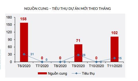 Tỷ lệ tiêu thụ đạt 28% khoảng 11 căn, bằng 73% so với tháng 10/2020. Nguồn cung mới tăng nhẹ so với tháng trước nhưng mức tăng không đáng kể.