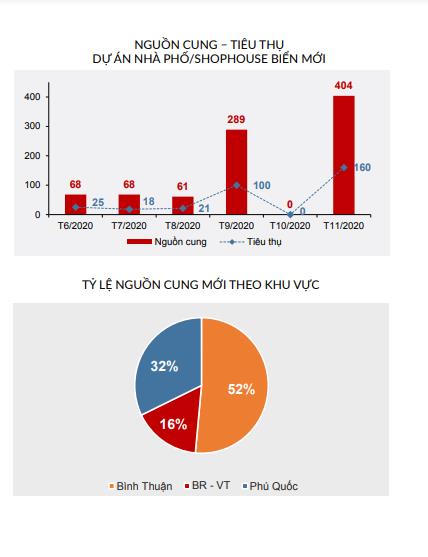 Đối với phân khúc shophouse biển, trong tháng 11/2020 thị trường ghi nhận có 3 dự án mở bán, cung cấp ra thị trường 404 căn. Tỷ lệ tiêu thụ đạt 40% (khoảng 160 căn).