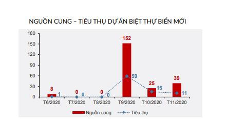 Báo cáo của DKRA Vietnam cho biết, trong tháng 11/2020 phân khúc biệt thự biển ghi nhận 39 căn mở bán đến từ 1 dự án (thuộc giai đoạn tiếp theo của dự án trước đó), tăng 56% so với tháng trước.