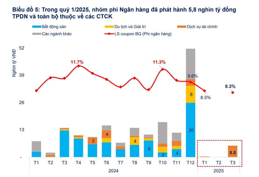 Trong khi đó, Chứng khoán là ngành phi Ngân hàng duy nhất huy động vốn qua phát hành TPDN trong tháng 3 và cả quý 1/2025. Đáng nói, không có đợt phát hành nào của nhóm Bất động sản được ghi nhận trong quý I vừa qua. Sự vắng mặt hoàn toàn của ngành Bất động sản – vốn từng chiếm tỷ trọng lớn trong các kỳ trước – tiếp tục cho thấy áp lực và khó khăn trong việc huy động vốn qua kênh TPDN ở nhóm này.