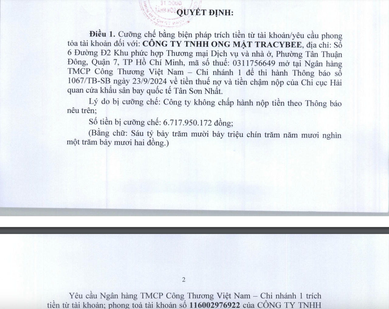 Cụ thể, Quyết định cưỡng chế được thực hiện đối với Công ty TNHH Ong mật Tracybee để thi hành thông báo về tiền nợ thuế và tiền chậm nộp, số tiền bị cưỡng chế 6,7 tỷ đồng.