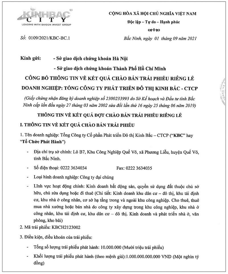Theo thông tin từ phía Tổng công ty Phát triển Đô thị Kinh Bắc – CTCP (Mã: KBC), doanh nghiệp vừa công bố kết quả chào bán thành công 1.000 tỷ đồng trái phiếu với kỳ hạn 24 tháng.