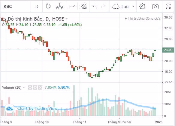 Đến phiên ngày 29/12, cổ phiếu KBC vẫn giữ sắc xanh và giao dịch ở mức giá 23.900 đồng/cổ phiếu.