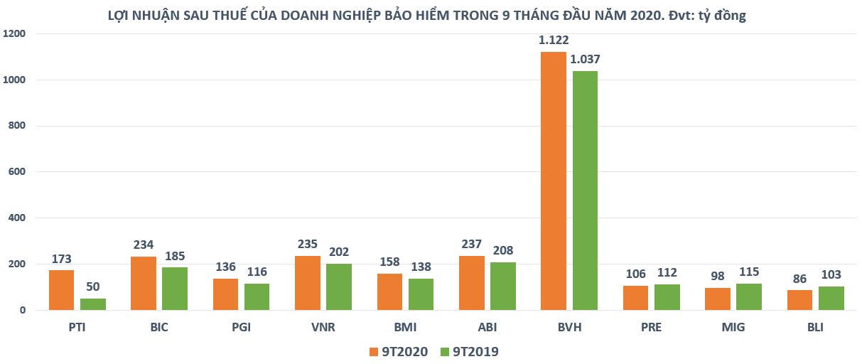 Riêng Tổng CTCP Bảo hiểm Bưu điện (PTI) đặt mục tiêu doanh thu từ hoạt động kinh doanh bảo hiểm đạt 6.350 tỷ đồng và lợi nhuận sau thuế hợp nhất đạt 130 tỷ đồng, lần lượt tăng 10% và 15% so với năm 2019. Sau 9 tháng, Công ty đã vượt 33% mục tiêu lợi nhuận sau thuế cả năm 2020. Theo đó, lãi sau thuế 9 tháng đầu năm đạt gần 173 tỷ đồng, tăng 248% so với cùng kỳ 2019.