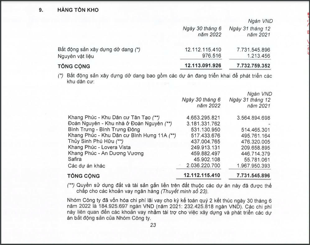 Cụ thể, kết thúc quý II/2022, hàng tồn kho của KDH tăng mạnh từ 7.732 tỷ đồng lên 12.113 tỷ đồng. Hầu hết đều là bất động sản xây dựng dở dang tại các dự án như Khang Phúc - Khu dân cư Tân Tạo; Đoàn Nguyên - Khu nhà ở Đoàn Nguyên; Khu Dân cư Bình Hưng 11A; Thủy Sinh Phú Hưuux, Lovera Vista, An Dương Vương, Safira; Bình Trưng Đông.