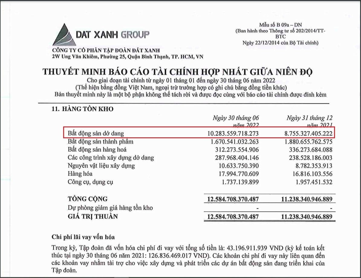 Trong cơ cấu hàng tồn kho, chủ yếu tăng ở khoản bất động sản dở dang từ 8.755 tỷ đồng lên 10.283 tỷ đồng.