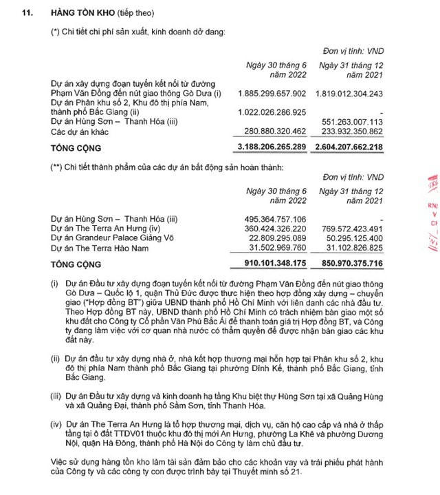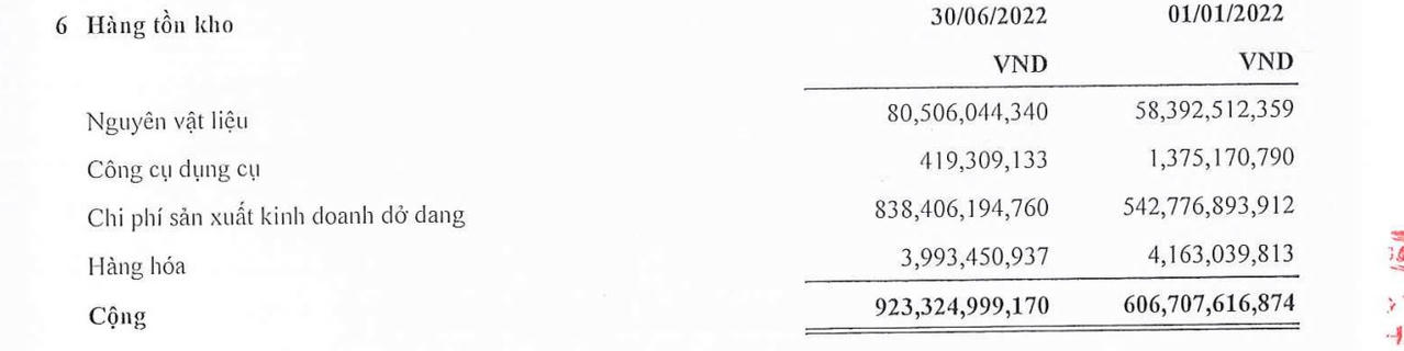 Giá trị hàng tồn kho ghi nhận ở mức 4.099 tỷ đồng. Trong đó ghi nhận, doanh nghiệp đầu tư chi phí sản xuất, kinh doanh dở dang vào các dự án Hùng Sơn - Thanh Hoá; dự án Phân khu 2, Khu đô thị phía Nam, Tp. Bắc Giang; dự án BT tuyến đường kết nối Phạm Văn Đồng - Gò Dưa.