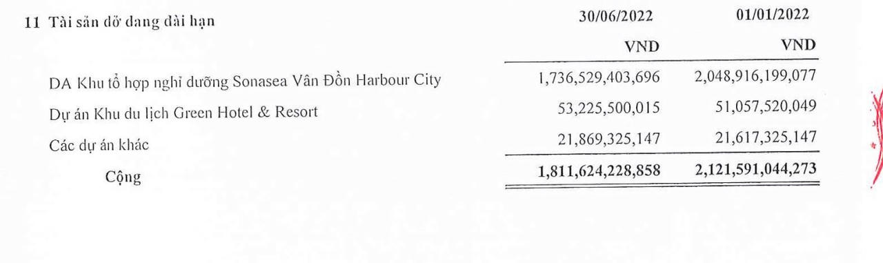 Ngoài ra, doanh nghiệp còn gần 1.812 tỷ đồng chi phí xây dựng cơ bản dở dang (giảm 15% so với đầu năm), tập trung tại Khu tổ hợp nghỉ dưỡng Sonasea Vân Đồn Harbour City (hơn 1.736 tỷ đồng), Khu du lịch Green Hotel & Resort (hơn 53 tỷ đồng)...