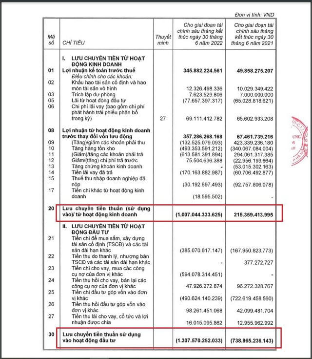 Đáng chú ý, dòng tiền của VPI cũng là một vấn đề lớn khi cả dòng tiền kinh doanh và đầu tư đều ghi nhận âm hàng nghìn tỷ đồng. Cụ thể, tính đến ngày 30/6, dòng tiền kinh doanh của VPI âm 1.007 tỷ đồng trong khi cùng kỳ dương 215 tỷ đồng. Còn dòng tiền đầu tư âm đến 1.307,5 tỷ đồng, cùng kỳ cũng âm 738,8 tỷ đồng.