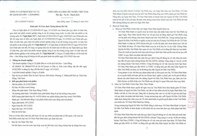 Theo thông tin từ Sở giao dịch Chứng khoán Hà Nội (HNX), CTCP Đầu tư và Du lịch Sài Gòn - Lâm Đồng đã hoàn tất phát hành 16.070 trái phiếu có mã SLTCH2328001 với mệnh giá 100 triệu đồng/trái phiếu vào ngày 29/12/2023 với giá trị phát hành 1.607 tỷ đồng.