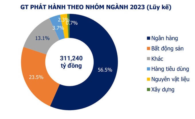 Trong đó, ngân hàng là nhóm ngành phát hành nhiều nhất với 176.006 tỷ đồng (tương đương 56,5% tổng giá trị phát hành). Theo sau là nhóm bất động sản phát hành khoảng 73.200 tỷ đồng, tăng 41% so với năm 2022.