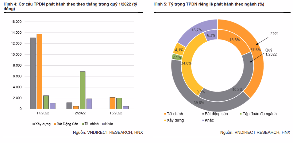 Tại báo cáo VNDirect cho biết, bất động sản là nhóm ngành chiếm tỷ trọng lớn nhất với 40,2% tổng giá trị phát hành Q1/22, tương đương 15.860 tỷ đồng (tăng 25,2% svck, giảm 86,5% so với quý trước). Các doanh nghiệp BĐS phát hành giá trị lớn nhất có thể kể đến như CTCP Đầu tư và Phát triển Eagle Side (3.930 tỷ đồng), CTCP Phát triển BĐS Đất Việt (1.600 tỷ đồng),...