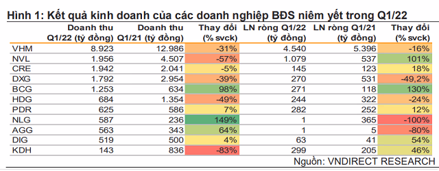 Bảng kết quả kinh doanh không mấy khả quan khi nhiều doanh nghiệp có mức doanh thu sụt giảm đáng kể, có nhiều doanh nghiệp có mức tăng trưởng âm. Cụ thể, doanh thu quý I/2022 của KDH (Nhà Khang Điền) chỉ đạt 143 tỷ đồng trong khi đó cùng kì năm ngoái đạt 836 tỷ đồng, tăng trưởng ở mức âm đến 83% nhưng lợi nhuận ròng lại lại tăng so với quý I năm 2021 đạt 299 tỷ đồng tăng 46% so với cùng kì.