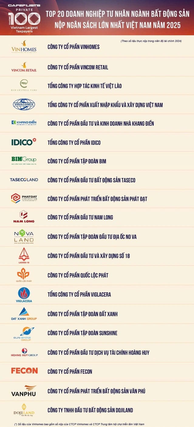Theo danh sách PRIVATE 100, Top 20 doanh nghiệp bất động sản nộp ngân sách năm 2024 là hơn 63.200 tỷ đồng, trong đó 13 doanh nghiệp có đóng góp trên 1.000 tỷ đồng mỗi đơn vị.