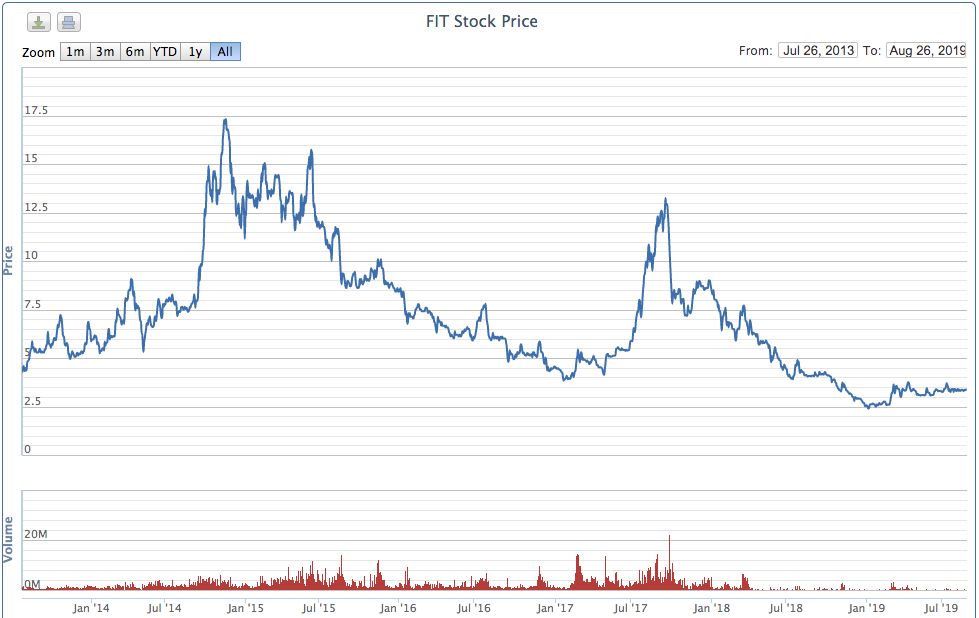 Lên sàn từ tháng 7/2013 đến nay, cổ phiếu FIT đã trải qua hai đợt tăng mạnh rồi lại lao dốc. Kết phiên 23/8 cổ phiếu FIT chốt ở 3.340 đồng/cp, giảm tới 81% so với mức đỉnh vào tháng 11/2014.
