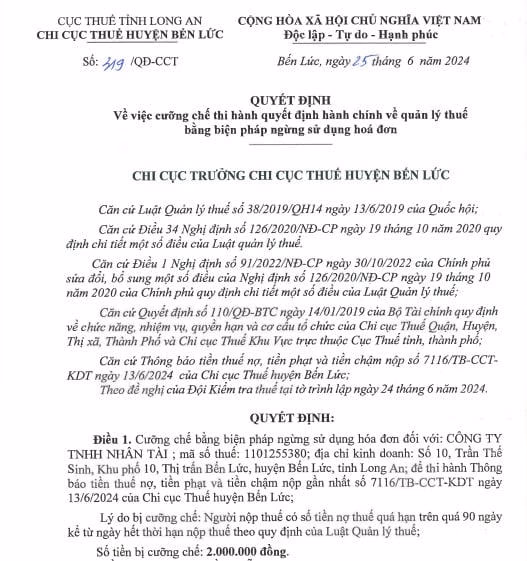 Chi cục Thuế huyện Bến Lức đã ra quyết định cưỡng chế bằng biện pháp ngừng sử dụng hóa đơn đối với 3 doanh nghiệp có số tiền nợ thuế 2 triệu đồng quá 90 ngày.