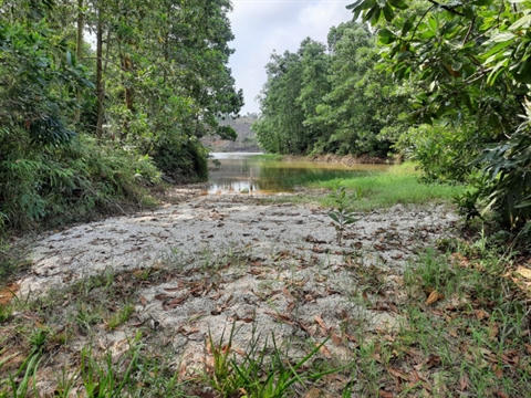 | Một góc hồ Cóc Sếnh cạn trơ đáy do đất đá từ mỏ đất trôi xuống |