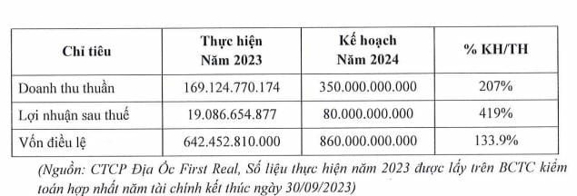 Đơn cử như CTCP Địa ốc First Real (mã FIR) vừa tổ chức thành công ĐHĐCĐ thường niên năm 2024 vào ngày 20/3 vừa qua. Đại hội thông qua kế hoạch kinh doanh năm 2024 đầy tham vọng với mục tiêu doanh thu thuần hợp nhất đạt 350 tỷ đồng, tăng 107% so với kết quả năm 2023 và lợi nhuận sau thuế dự kiến 80 tỷ đồng, gấp tới 4,2 lần năm ngoái.