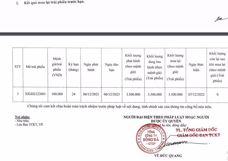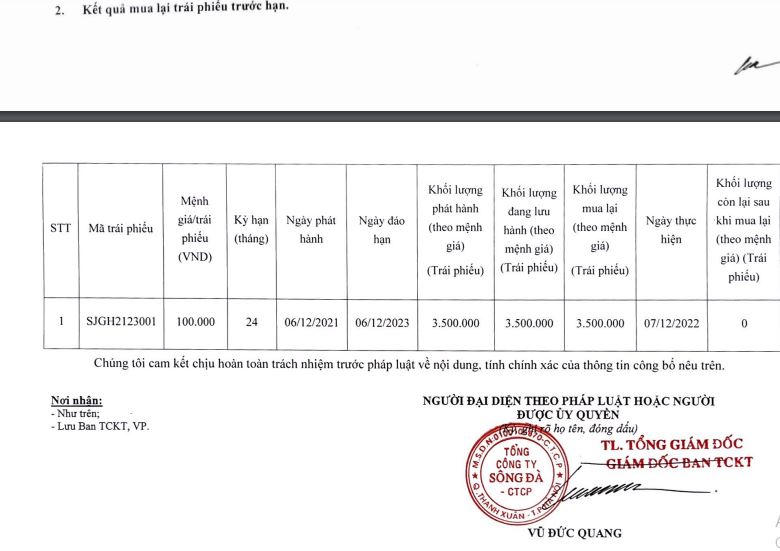 Ngày 7/12, Tổng công ty Sông Đà cũng hoàn tất mua lại trước hạn 350 tỷ đồng trái phiếu mã SJGH2123001 phát hành năm 2021, dư nợ còn lại của lô trái phiếu là 0 đồng.