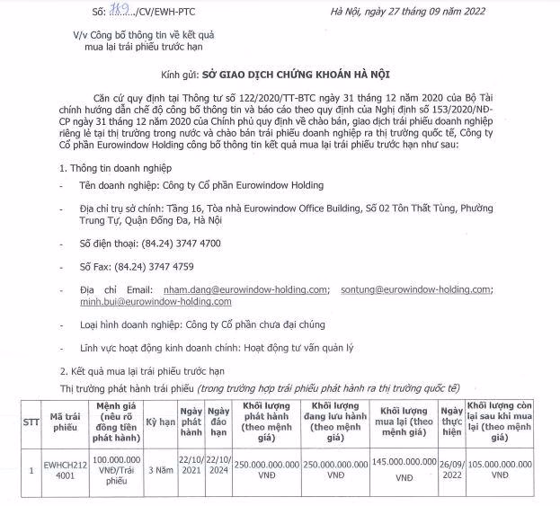 Ngày 21/11, HNX thông báo Công ty CP Eurowindow Holding đã chi tiền mua lại 145 tỷ đồng của lô trái phiếu trị giá 250 tỷ đồng mã EWHCH2124001 được phát hành ngày 22/10/22021 và đáo hạn ngày 22/10/2024. Do đó, khối lượng còn lại sau khi mua lại là 105 tỷ đồng.