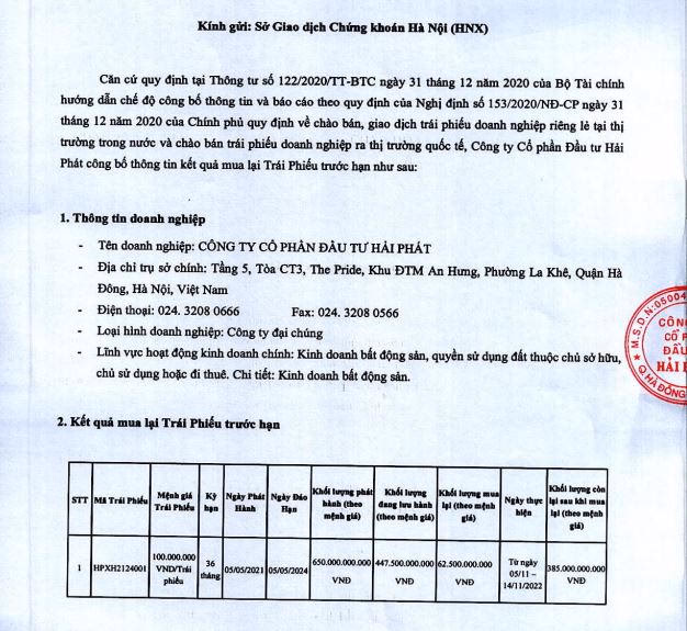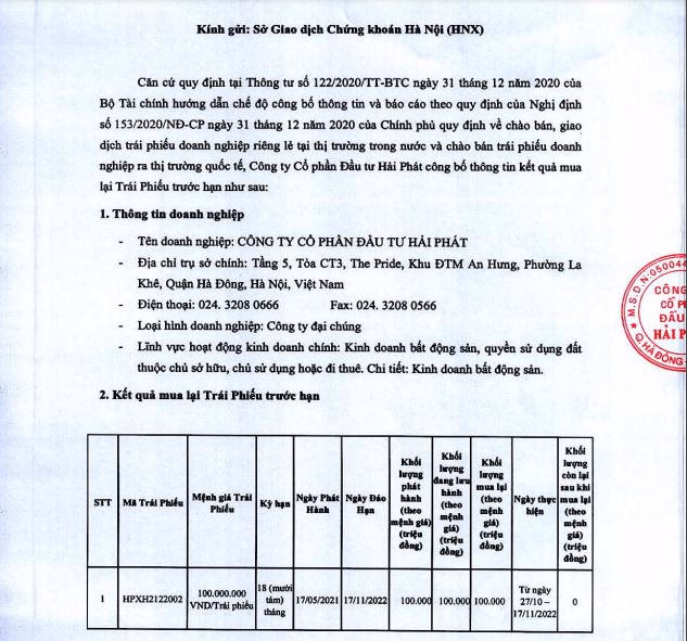 Đơn cử, tháng 11/2022, CTCP Đầu tư Hải Phát hoàn tất mua lại 2 lô trái phiếu trước hạn. Cụ thể, lô trái phiếu HPXH2124001 có kỳ hạn 36 tháng được phát hành vào tháng 5/2021, đáo hạn vào tháng 5/2024. Mệnh giá đạt 100.000 đồng/trái phiếu, tổng số lượng phát hành là 650 triệu trái phiếu tương đương giá trị 650 tỷ đồng.