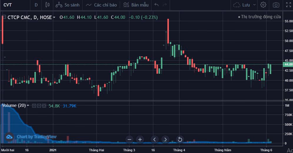Kết thúc phiên giao dịch ngày 3/6, cổ phiếu CVT tiếp tục ghi nhận sắc đỏ, thị giá cổ phiếu ở mức 44.000 đồng/cp, giảm hơn 20% so với đỉnh vừa lập.
