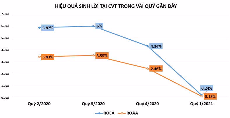 Đáng chú ý, chỉ số ROEA (tỷ suất lợi nhuận trên vốn chủ sở hữu bình quân) tại CVT giảm mạnh qua các quý. Từ 5,8% trong quý 2/2020 xuống còn 0,24% trong quý 1/2021.