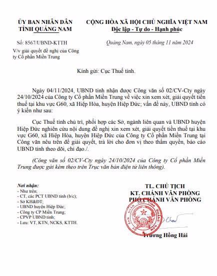UBND tỉnh Quảng Nam giao Cục Thuế tỉnh chủ trì, phối hợp các sở, ngành liên quan và UBND huyện Hiệp Đức nghiên cứu nội dung đề nghị xin xem xét, giải quyết tiền thuế tại khu vực G60 của Công ty CP Miền Trung.