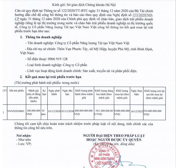 Ngày 16/12, CTCP Năng lượng Tái tạo Việt Nam Việt cũng đã mua lại 9 tỷ đồng trái phiếu mã VNVH2030001 với tổng giá trị phát hành 600 tỷ đồng. Lô trái phiếu được phát hành tháng 12/2020 và đáo hạn 12/2030. Trước đó, tháng 9/2022 doanh nghiệp mảng năng lượng tái tạo này cũng đã mua lại một phần lô trái phiếu.