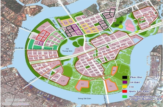Đại Quang Minh, Lotte, Sunshine, Phát Đạt, Hongkong Land, CII, ... là những "đại gia" bất động sản đang sở hữu những dự án có vốn đầu tư lớn tại khu vực Thủ Thiêm của TP.HCM.