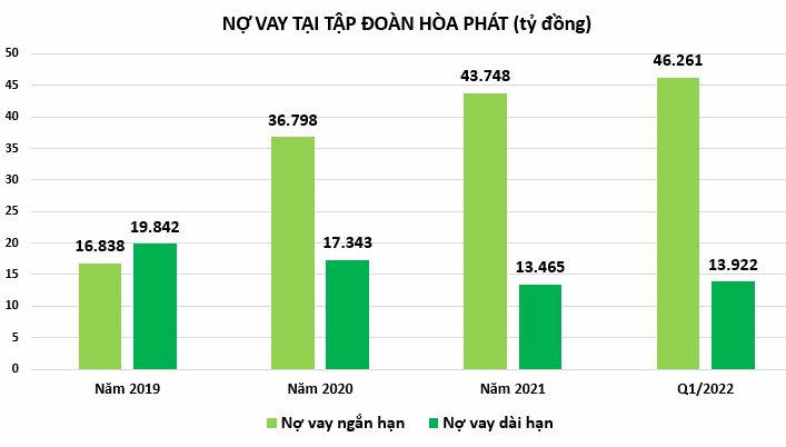 Cụ thể tại Tập đoàn Hòa Phát, tính đến 31/3/2022, nợ vay của Hòa Phát cán mốc gần 60.183 tỷ đồng, tương đương tăng thêm 2.970 tỷ đồng nợ vay chỉ trong 3 tháng đầu năm, chiếm khoảng 32% tổng tài sản của tập đoàn. Trong đó, nợ vay ngắn hạn tăng từ 43.748 tỷ lên 46.261 tỷ, dư nợ vay dài hạn tăng nhẹ lên 13.922 tỷ đồng.