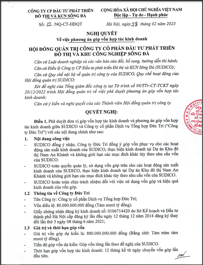 Theo thông tin được công bố, 880 tỷ đồng tiền góp vốn của Đức Trí vào Sudico sẽ được dùng cho các hoạt động sản xuất kinh doanh của Sudico, thực hiện kinh doanh tại dự án Khu đô thị Nam An Khánh và không giới hạn các mục đích khác tùy theo nhu cầu vốn của Sudico.
