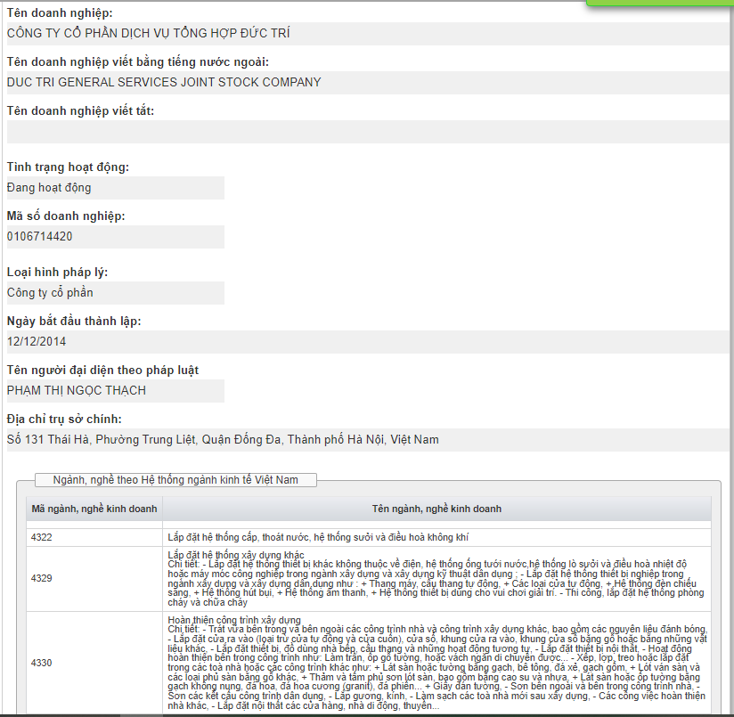 Theo tìm hiểu, Công ty cổ phần Dịch vụ tổng hợp Đức Trí được thành lập ngày 12/12/2014, vốn điều lệ 80 tỷ đồng. Doanh nghiệp có địa chỉ tại số 131 Thái Hà, phường Trung Liệt, quận Đống Đa, Hà Nội.